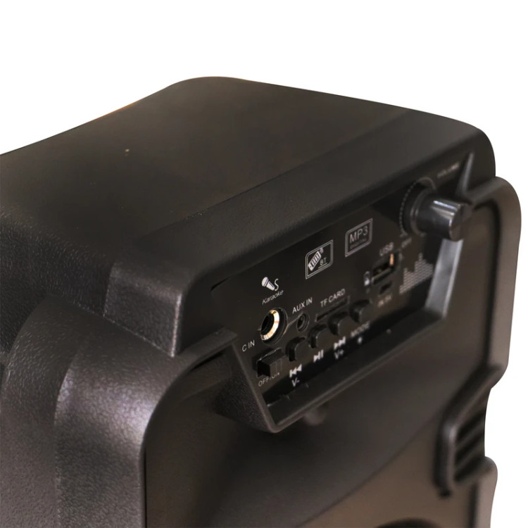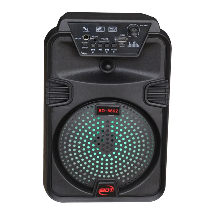 اگر به دنبال اسپیکر به همراه میکروفون هستید، اسپیکر BD-6602 یکی از بهترین گزینههایتان است. این اسپیکر کیفیت بالایی داشته و میتوانید برای اجرای زنده یا مراسم از آن استفاده کنید. این مدل دستگیره تلسکوپی داشته و میتوانید آن را به صورت چمدانی جابهجا کنید. با توجه به ابعاد این مدل وزن استانداردی دارد. این مدل از طریق USB، شیار کارت حافظه و جک 3.5 میلیمتری قابلیت پخش موسیقی از دستگاه یا فلش را به شما میدهد. در قسمت جلویی این اسپیکر از نورپردازی استفادهشده است. در محیطهای تاریک این نورپردازی میتوان فضایتان را زیباتر کند.