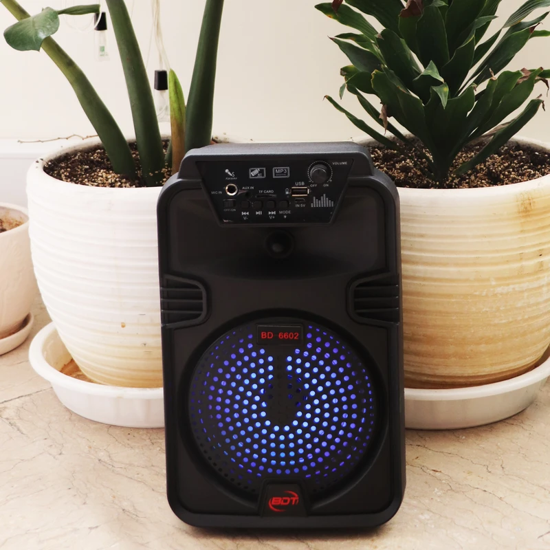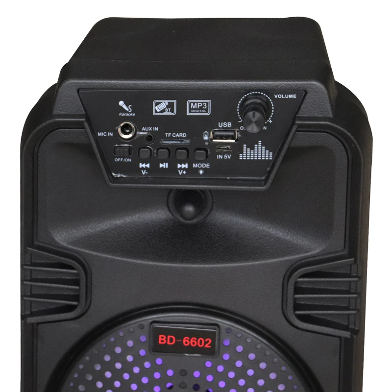 اگر به دنبال اسپیکر به همراه میکروفون هستید، اسپیکر BD-6602 یکی از بهترین گزینههایتان است. این اسپیکر کیفیت بالایی داشته و میتوانید برای اجرای زنده یا مراسم از آن استفاده کنید. این مدل دستگیره تلسکوپی داشته و میتوانید آن را به صورت چمدانی جابهجا کنید. با توجه به ابعاد این مدل وزن استانداردی دارد. این مدل از طریق USB، شیار کارت حافظه و جک 3.5 میلیمتری قابلیت پخش موسیقی از دستگاه یا فلش را به شما میدهد. در قسمت جلویی این اسپیکر از نورپردازی استفادهشده است. در محیطهای تاریک این نورپردازی میتوان فضایتان را زیباتر کند.